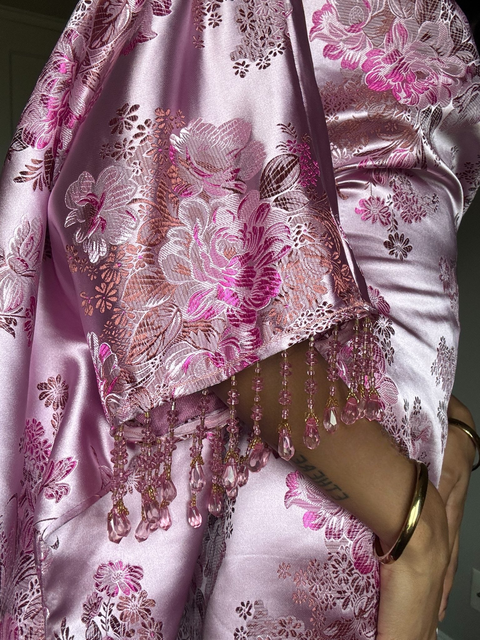 Made with soft and shiny silk jacquards, satins, and more. Customers love this off the shoulder butterfly maxi dress for its divine and luxury touch. This elegant dress is inspired by the beautiful dresses made in African and Middle Eastern culture. The name "Almyra" means "princess" and "noble woman".