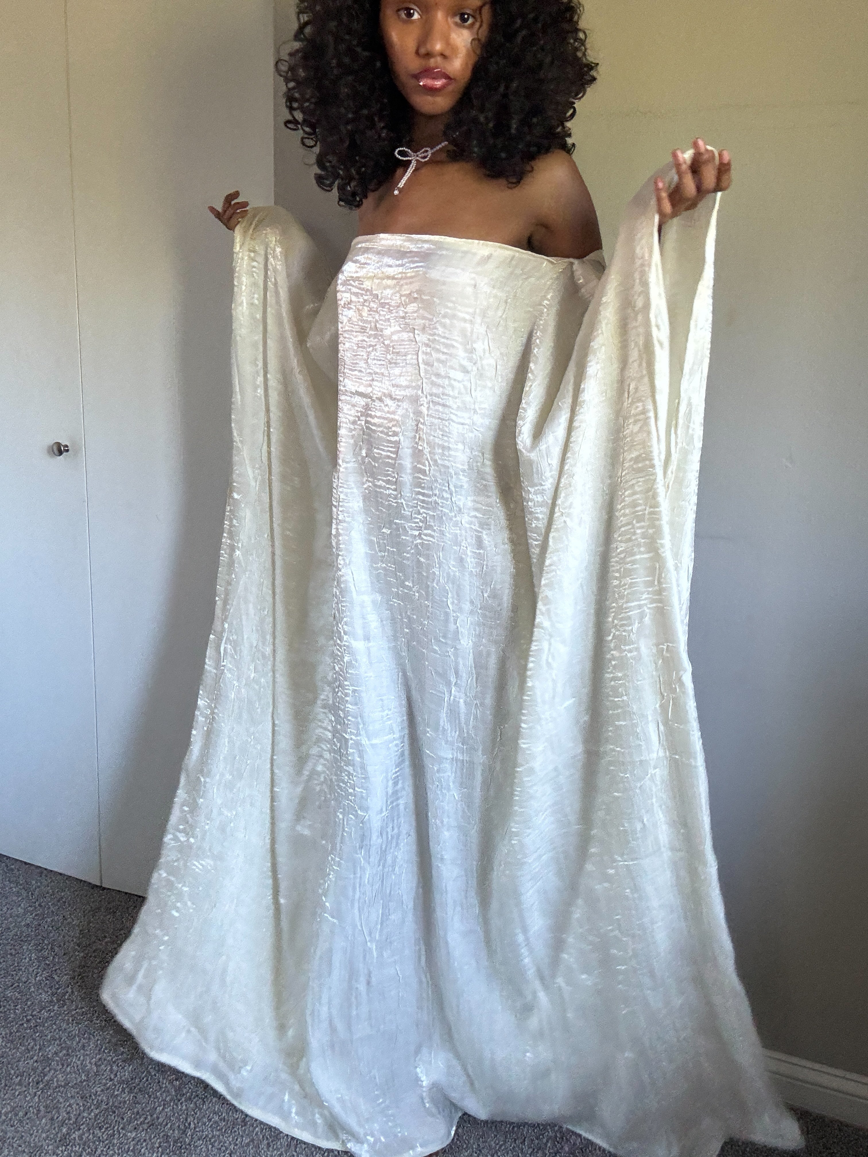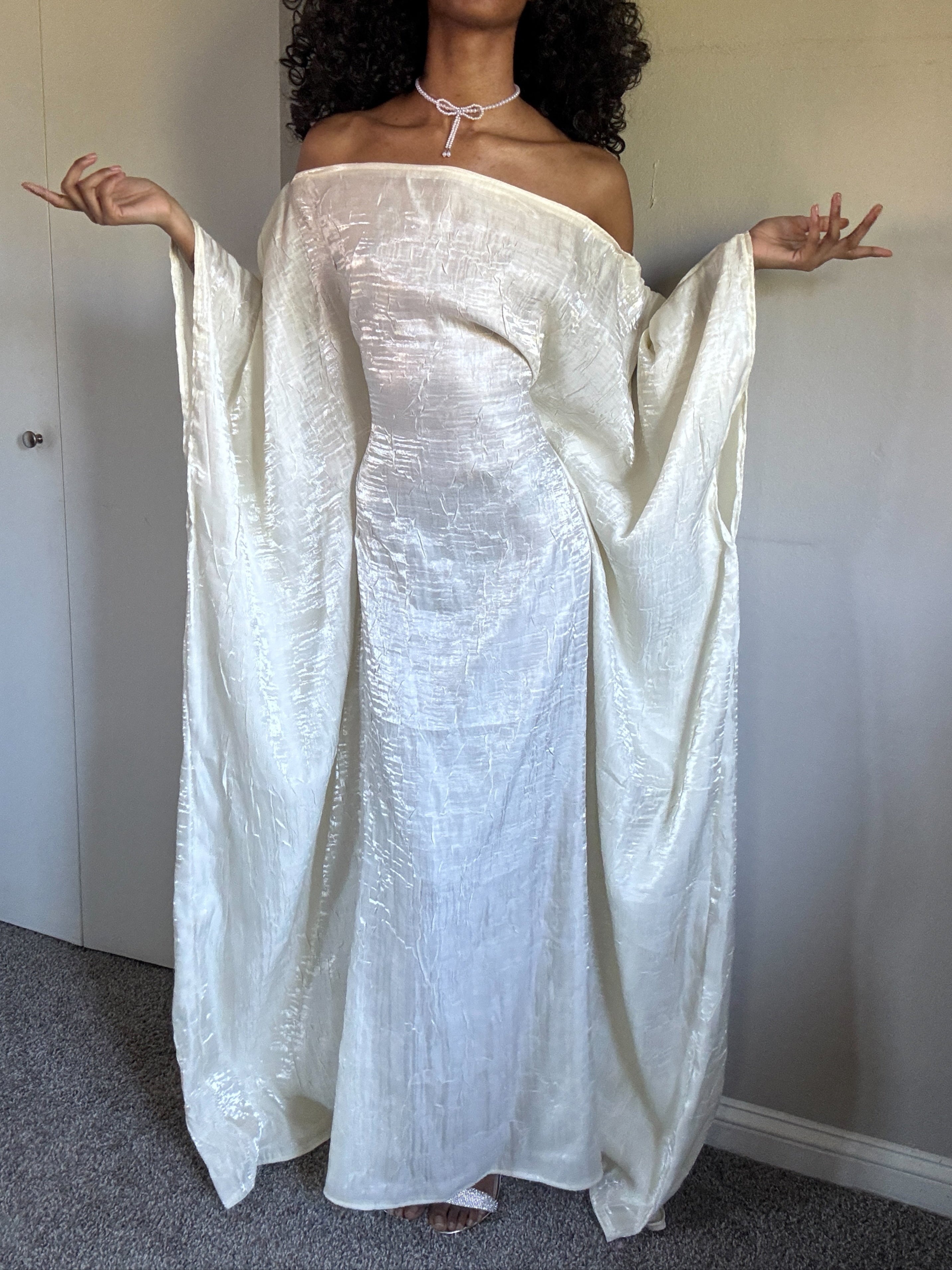 Made with soft and shiny silk jacquards, satins, and more. Customers love this off the shoulder butterfly maxi dress for its divine and luxury touch. This elegant dress is inspired by the beautiful dresses made in African and Middle Eastern culture. The name "Almyra" means "princess" and "noble woman".